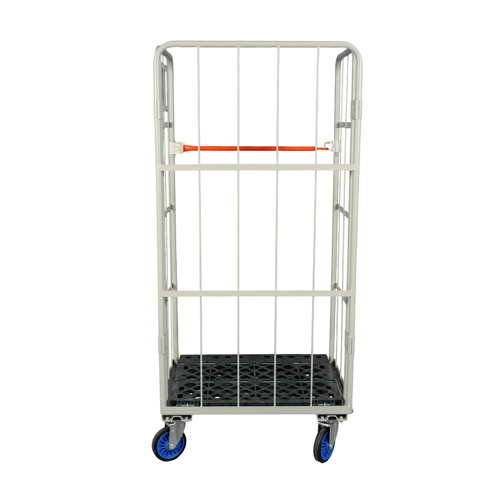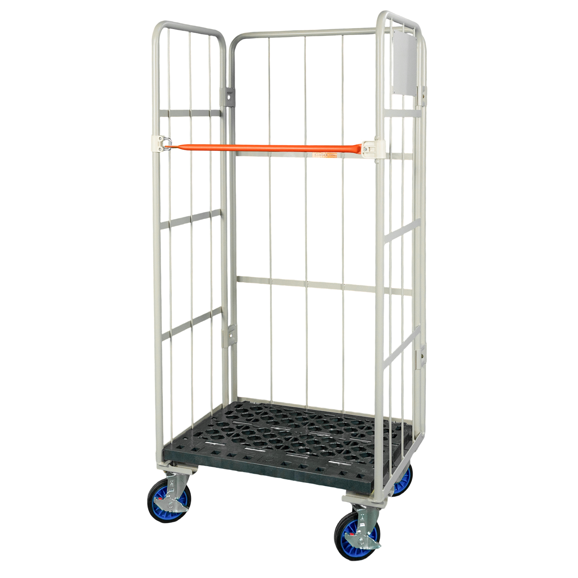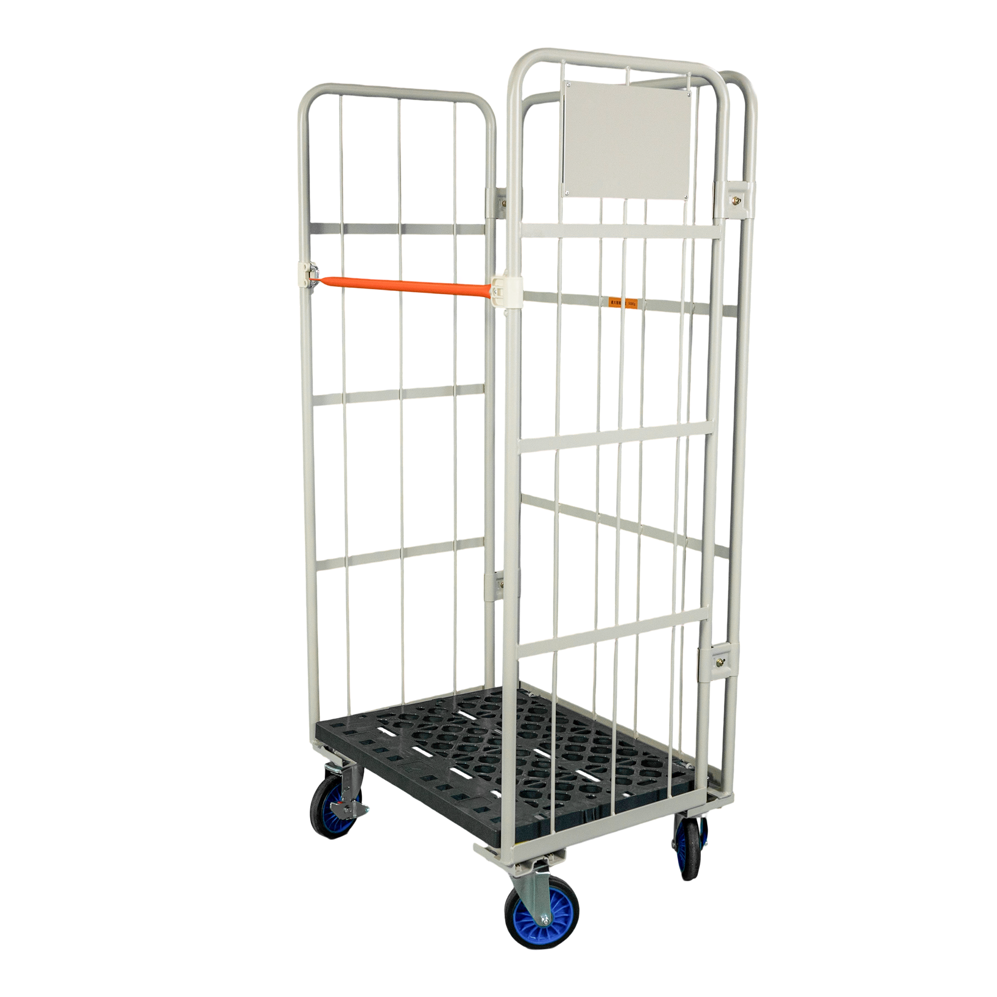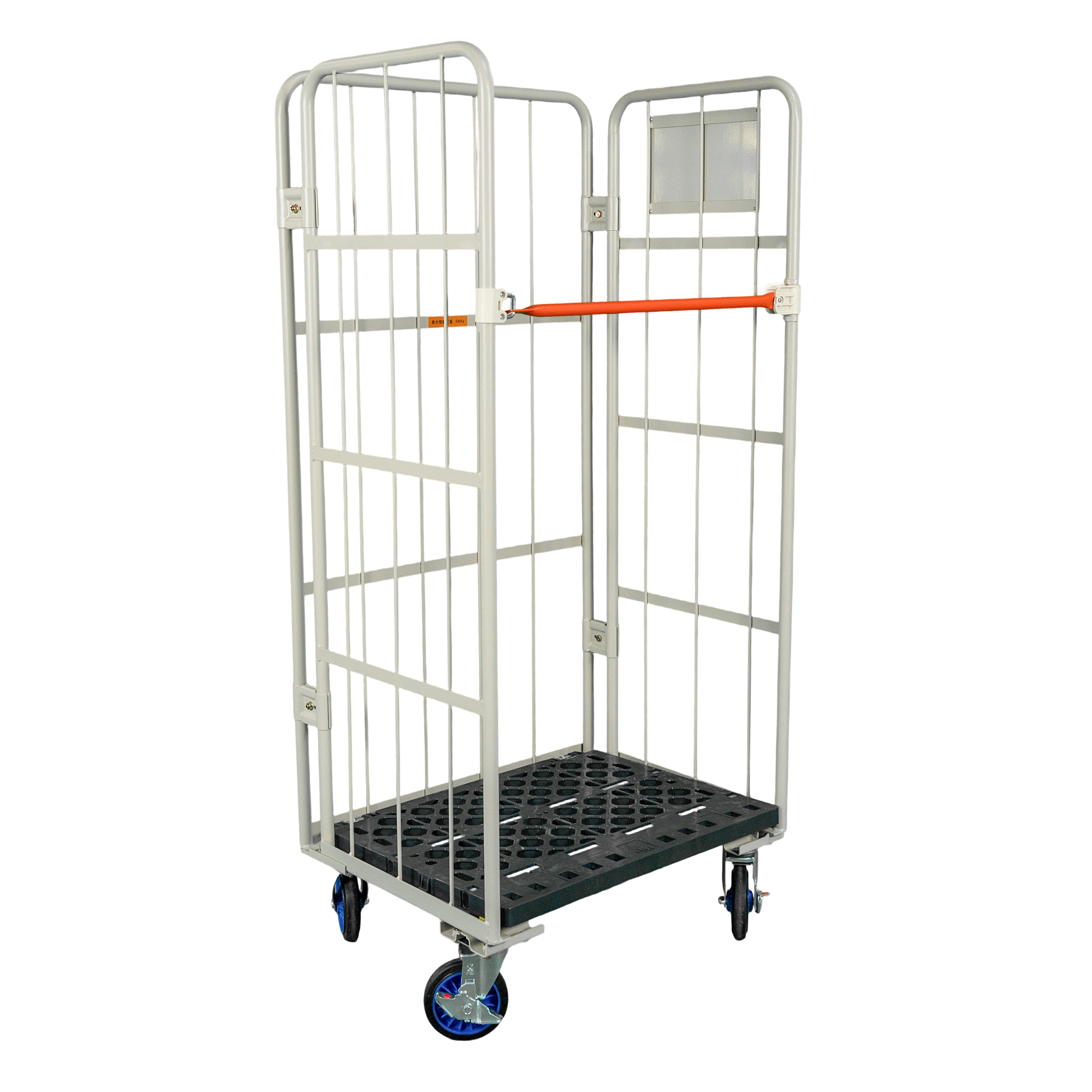 カゴ台車(カゴ車・ロールボックスパレット・ハイテナー・カーゴテナー)は、倉庫や店舗、物流現場で商品の運搬、一時保管、さらには店頭での陳列まで幅広く活用できるキャスター付きの台車です。三方または四方を囲むカゴ状の柵が積載物の落下を防ぎ、安全な輸送を実現します。使わない時は折りたたんでコンパクトに収納できるため、場所を取りません。また、複数台を連結して一度に運搬できるタイプもあり、作業効率の大幅を向上に貢献します。スムーズな移動と安定した保管で、物流の様々なシーンで活躍します。