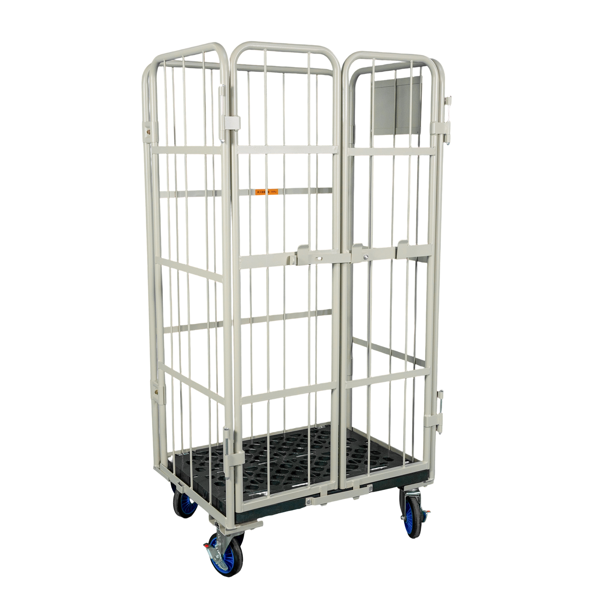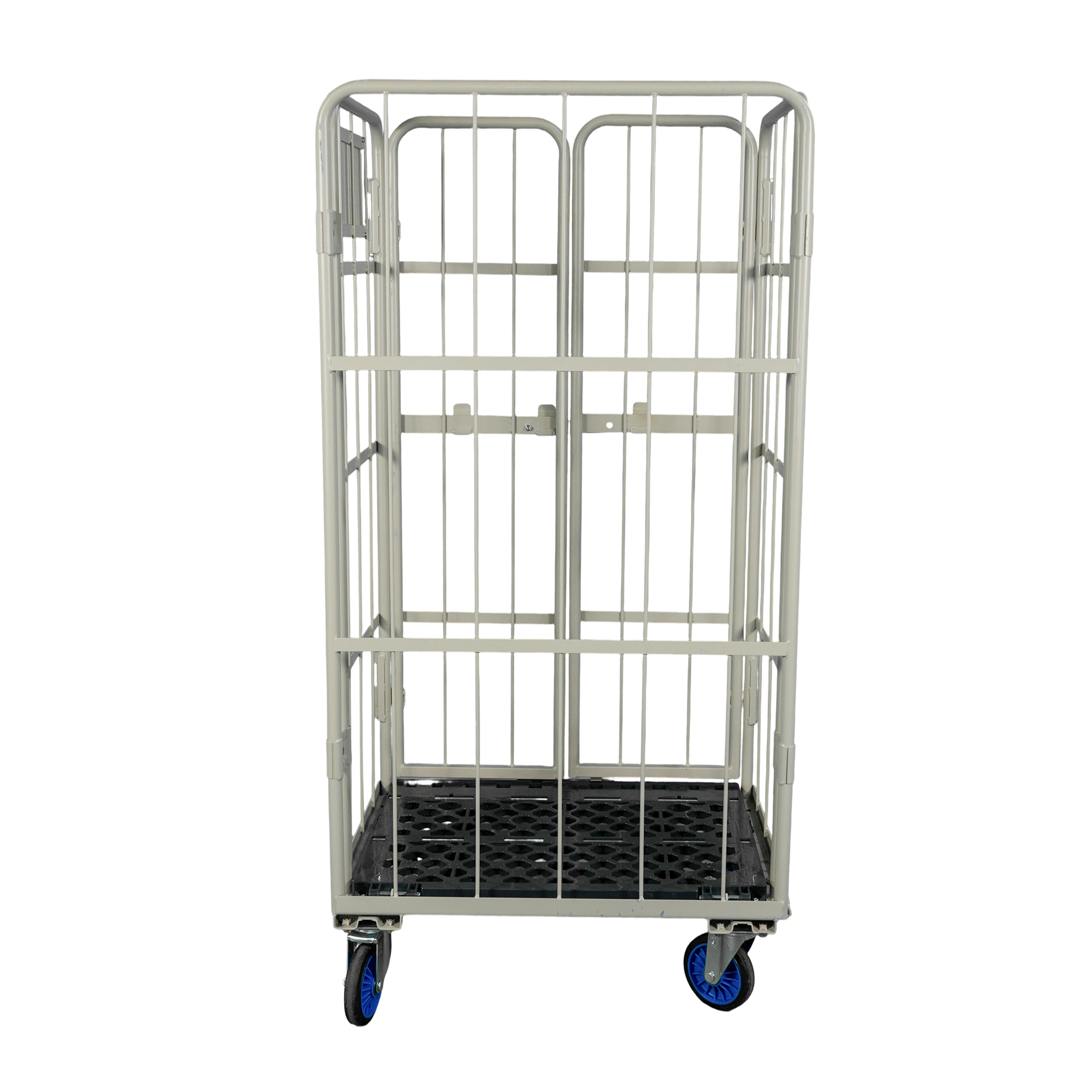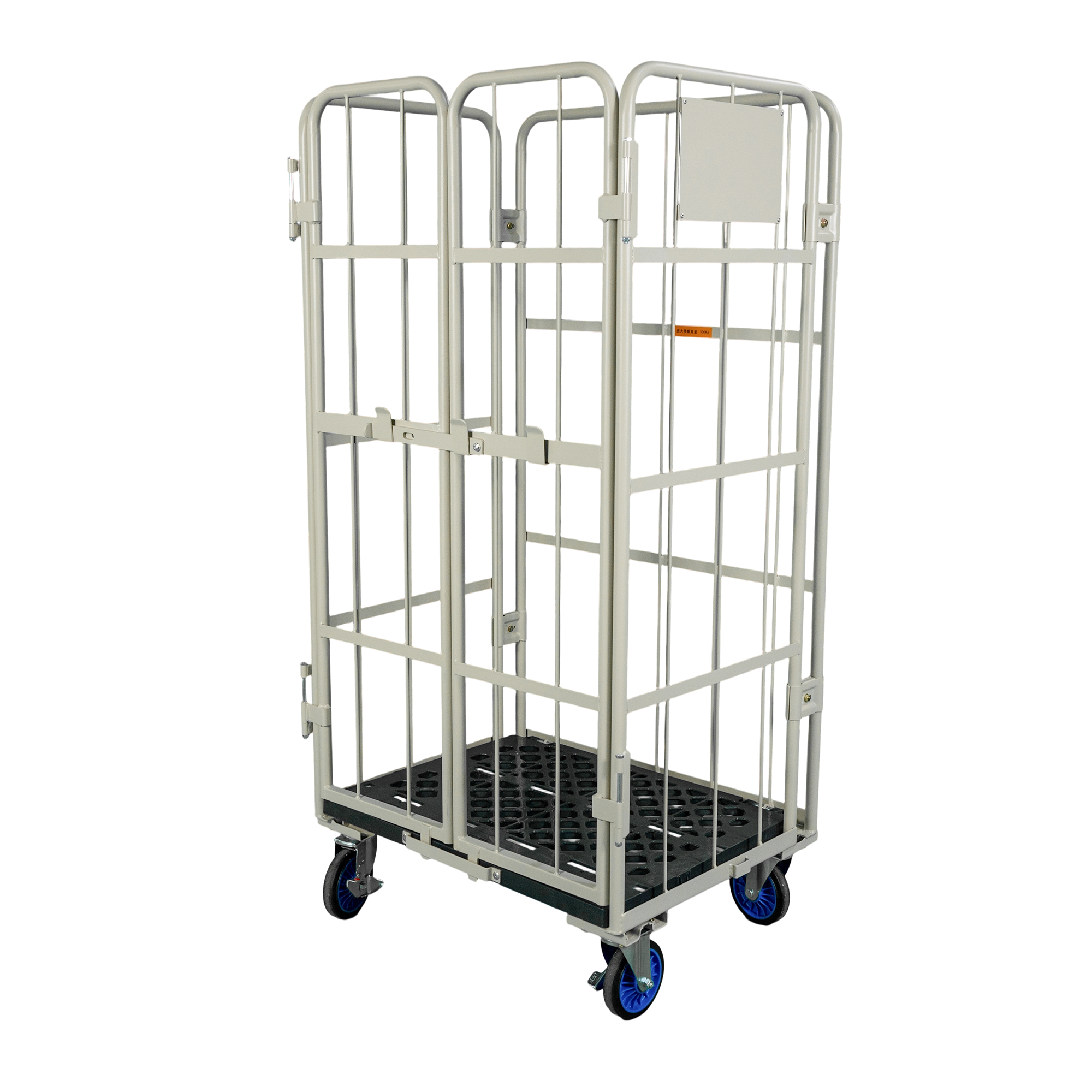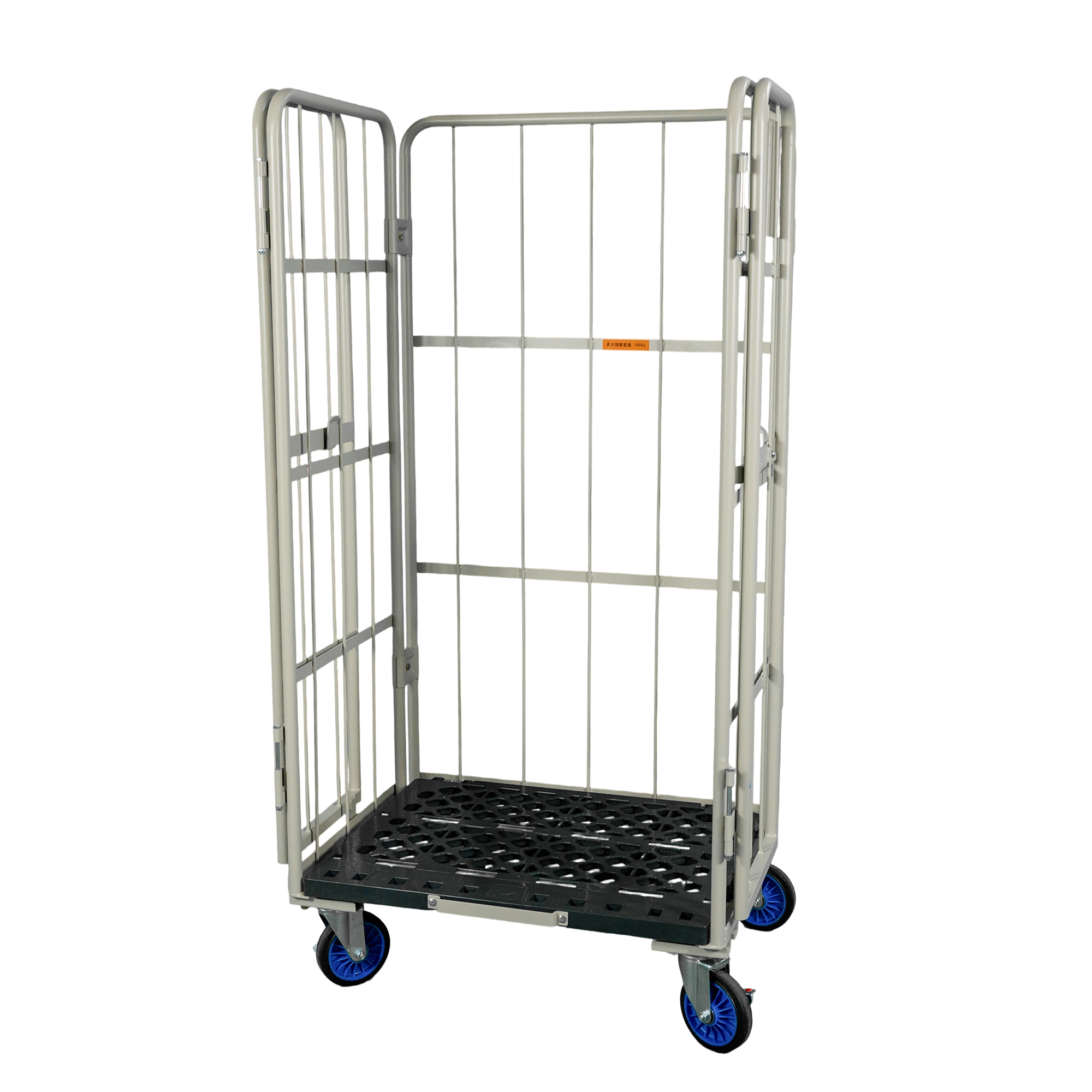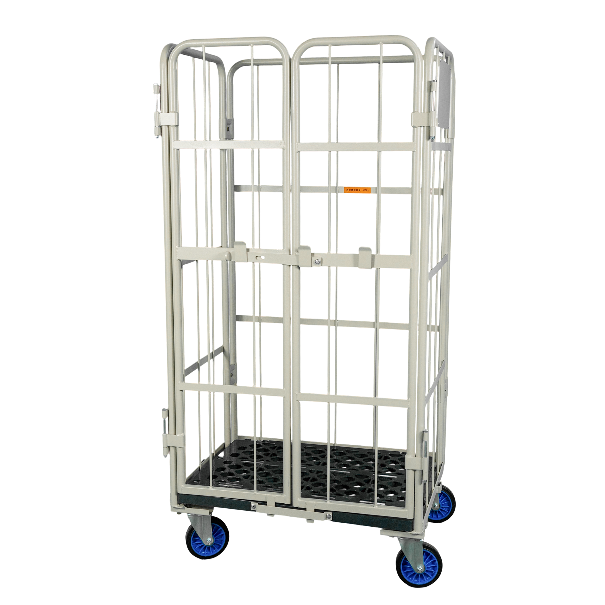 荷崩れ防止の観音扉付タイプです。観音扉で、荷物の出し入れもスムーズに行うことができます。未使用時にはL字型に折りたたんで収納可能です。