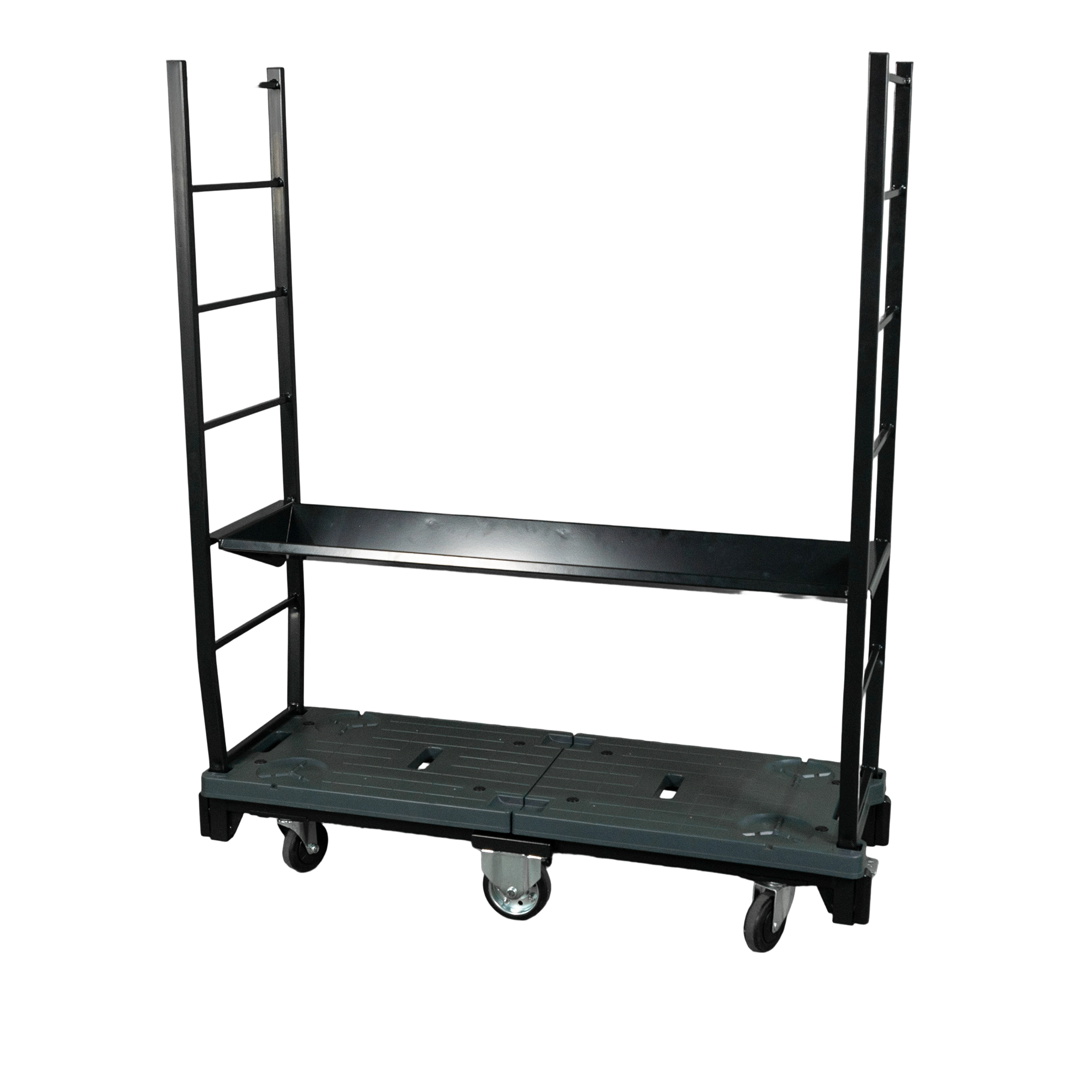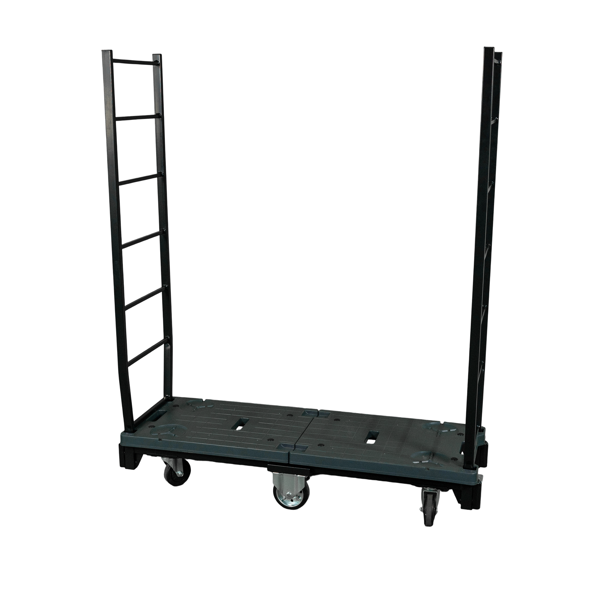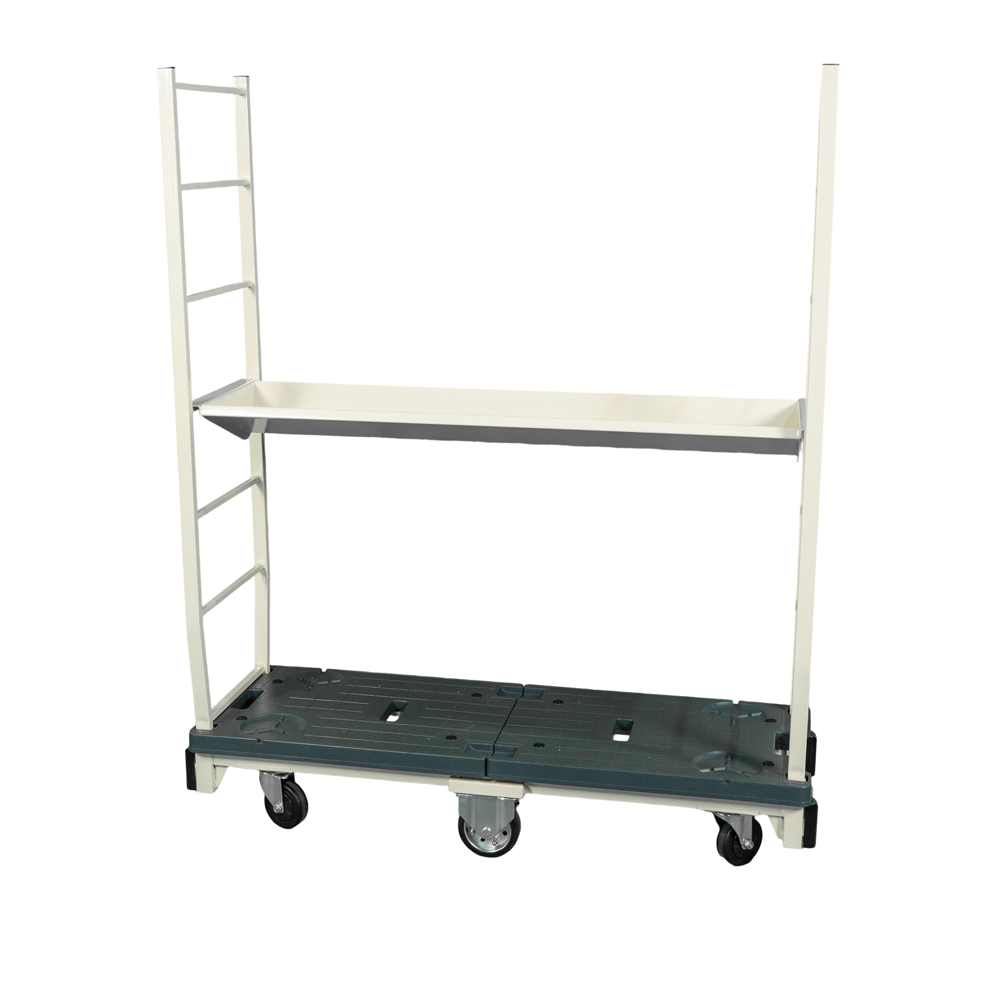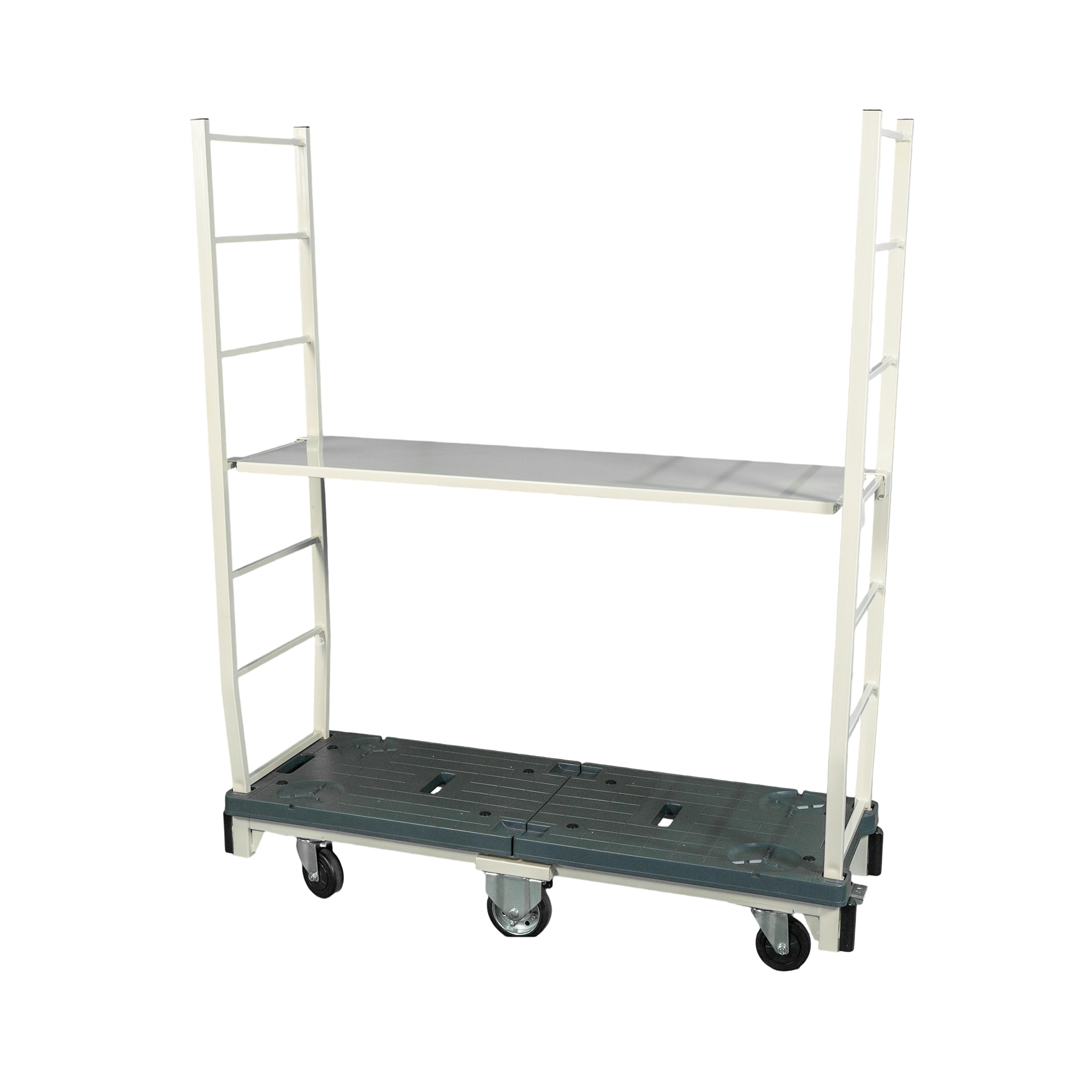 この6輪台車は、スリムなボディが特徴です。このスリムな設計により、狭い通路でもスムーズに取り回しができ、効率的な運搬を実現します。さらに、両側に着脱可能な落下防止柵を装備。